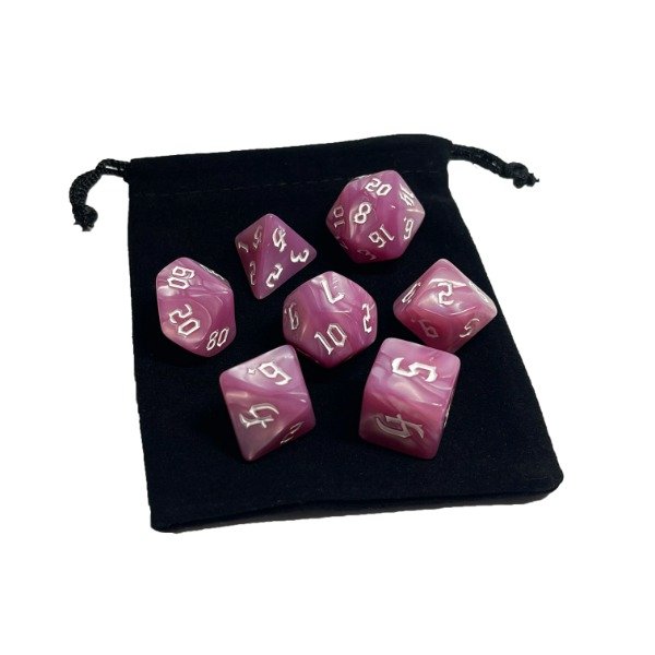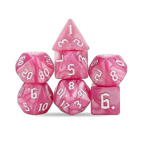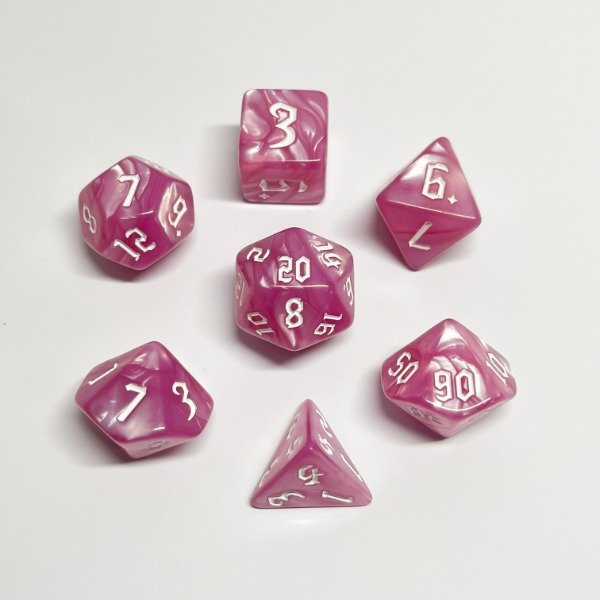 🎲 Prepárate para vivir aventuras épicas con este set completo de 7 dados con un hermoso Efecto Veteado en tonos Rosados y números Blancos, diseñado para Dungeons & Dragons, Pathfinder y otros juegos de rol.