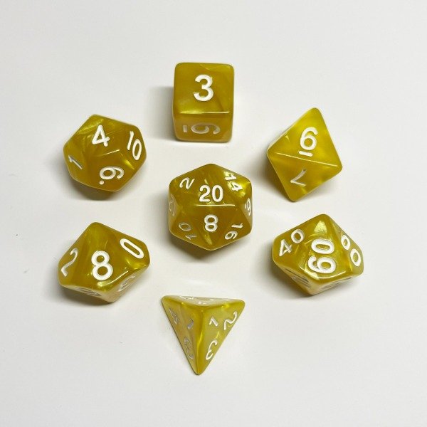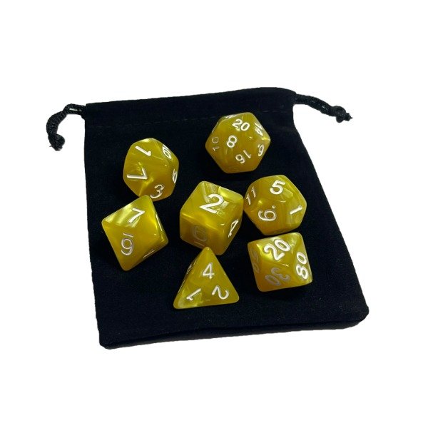 🎲 Prepárate para vivir aventuras épicas con este set completo de 7 dados con un hermoso Efecto Veteado en tonos Amarillo y números Blancos, diseñado para Dungeons & Dragons, Pathfinder y otros juegos de rol.