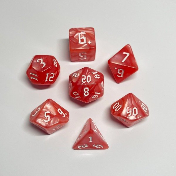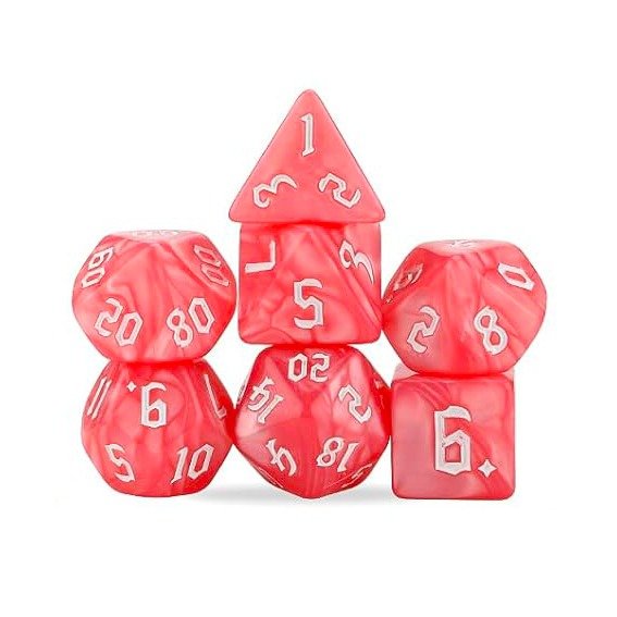 🎲 Prepárate para vivir aventuras épicas con este set completo de 7 dados con un hermoso Efecto Veteado en tonos Rosa Chicle y números Blancos, diseñado para Dungeons & Dragons, Pathfinder y otros juegos de rol.